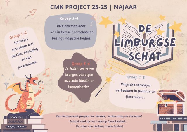 In het Limburgs Sprookjesboek ‘De schat van Limburg’ (Linda Gielen) staan verhalen zowel in het Nederlands als het Limburgs. Deze tweetalige verhalen vormen de inspiratiebron voor dit project waarin leerlingen zingen, muziek maken, bewegen en verhalen tot leven brengen.